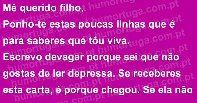 Escrevo devagar porque sei que não gostas de ler depressa. Se receberes esta carta, é porque chegou. Se ela não chegar, avisa-me que eu mando outra.